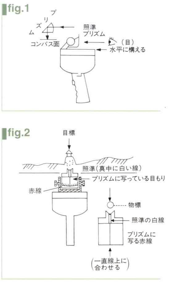 • グリップを握り、目標に対してコンパスを水平に構える。プリズムを図Fig.1のように調整する。