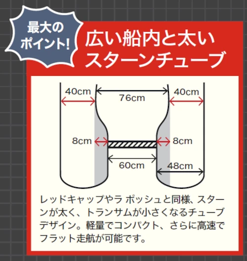 レッドキャップやラ ポッシュと同様、スターンが太く、トランサムが小さくなるチューブデザイン。軽量でコンパクト、さらに高速でフラット走航が可能です。