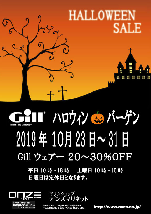 Gill ハロウィンバーゲン 2019Gill製品(マリンウェアー、マリングローブ、マリンシューズ、バック、サングラス、キャップ)とJIB製品(バック)などが定価より、20~30%offの大特価でご購入のチャンスです。