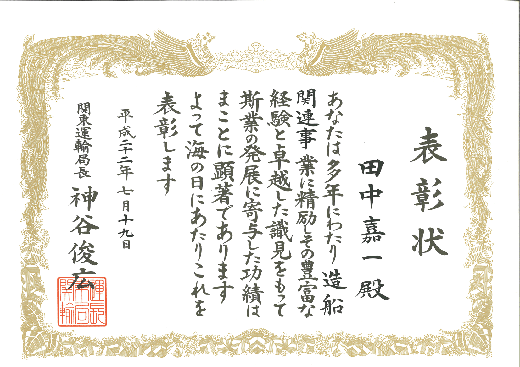 第15回「海の日」を記念して関東運輸局長矢田淑雄様より平成22年度海事功労表彰を受けました。 弊社は嘉永五年(1852年)創業以来159年にわたり、船舶関連業界一筋に営業活動をさせていただいております。 これもひとえに支えていただきました業界をはじめ、関係各位の皆様のご支援ご指導があってこその表彰であり、この場をかりて厚く御礼を申し上げます。 今後とも業界の発展のために、微力ではございますが貢献できるように頑張って参りたいと思っておりますので、引き続き田中産業株式会社を末永くよろしくお願い申し上げます。 平成22年7月19日