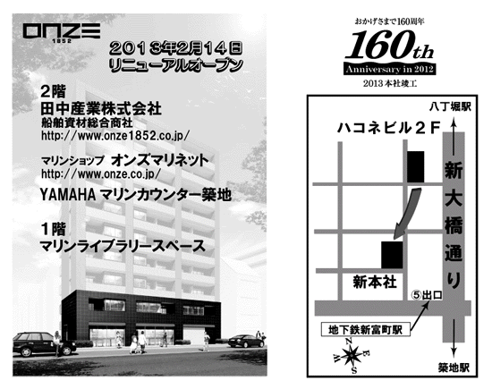 新社屋完成のため、2/9〜2/11日は引越でお休みと致します。 ショップのオープンは2/14日からとなります。 《移転場所》 東京都中央区新富2−12−4(オンズマリーナビル2F) 電話・FAX・メール等は従来通りで変更はありません。 田中産業株式会社 TEL03−3551−2461(代) FAX03−3551−2477 オンズマリネット TEL03−3206−6930 FAX03−3206−6921 YAMAHAマリンカウンター築地 TEL03−3206−6920 FAX03−3206−6921 有限会社 オンズプラン TEL03−3206−6931 FAX03−3206−6951 有限会社 オンズ TEL03−3551−1787 FAX03−3551−2477 |